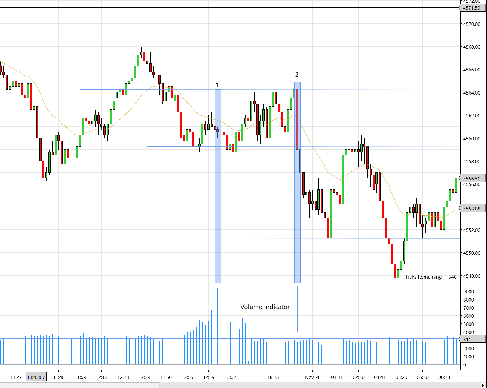 As you can see, in the candlestick that is inside the blue rectangle, labelled 1 is very small, yet the volume indicator is extremely high at the bottom. This signifies that lots of institutions and traders placed orders at that point and it was a very tight battle of buyers and sellers that hardly moved the market. Rectangle 2 shows a big candlestick with very low volume at the bottom, meaning that the huge majority of traders decided to sell the market. That low volume bar, means low transaction amount and the big candle signifies it mostly went for sells. This chart is the 2,000 tick chart, in that rectangle number 1, most of the transactions could of happened in a higher timeframe and therefore we saw the continuation of the trend downwards in square 2 in the smaller timeframe of 2,000 ticks.