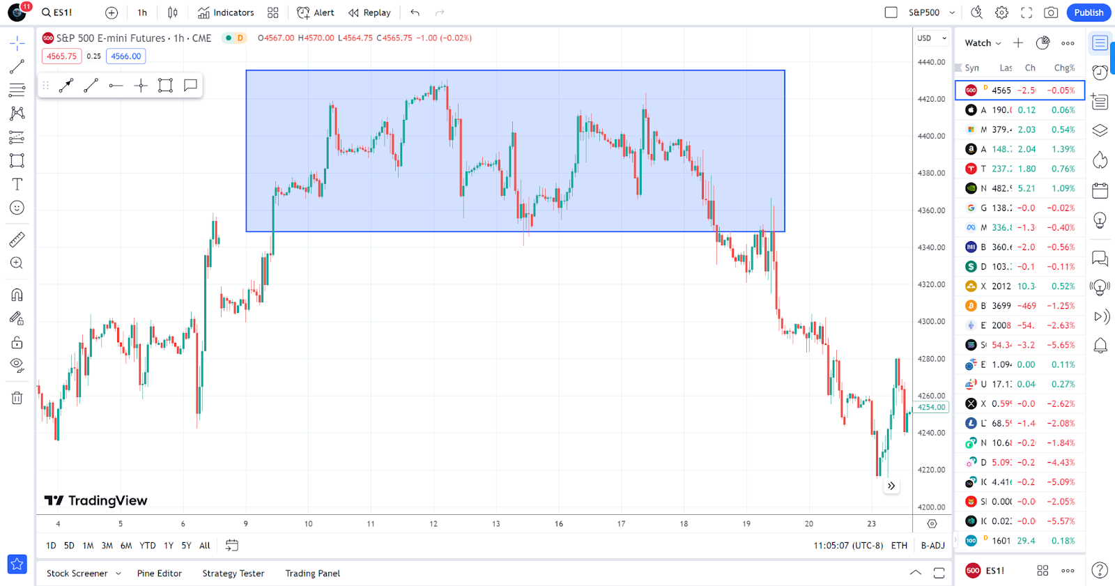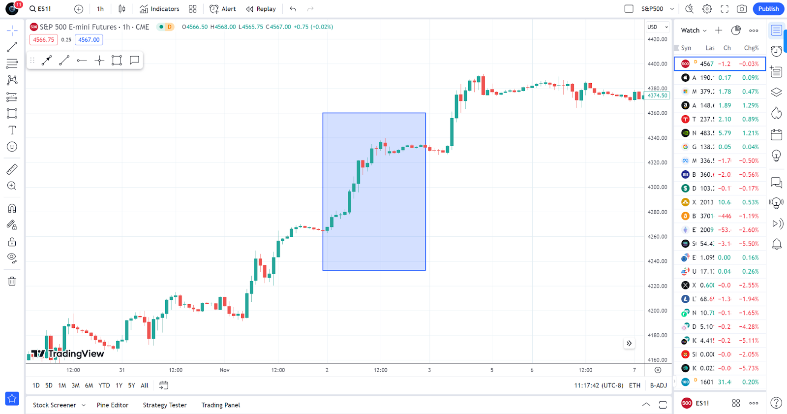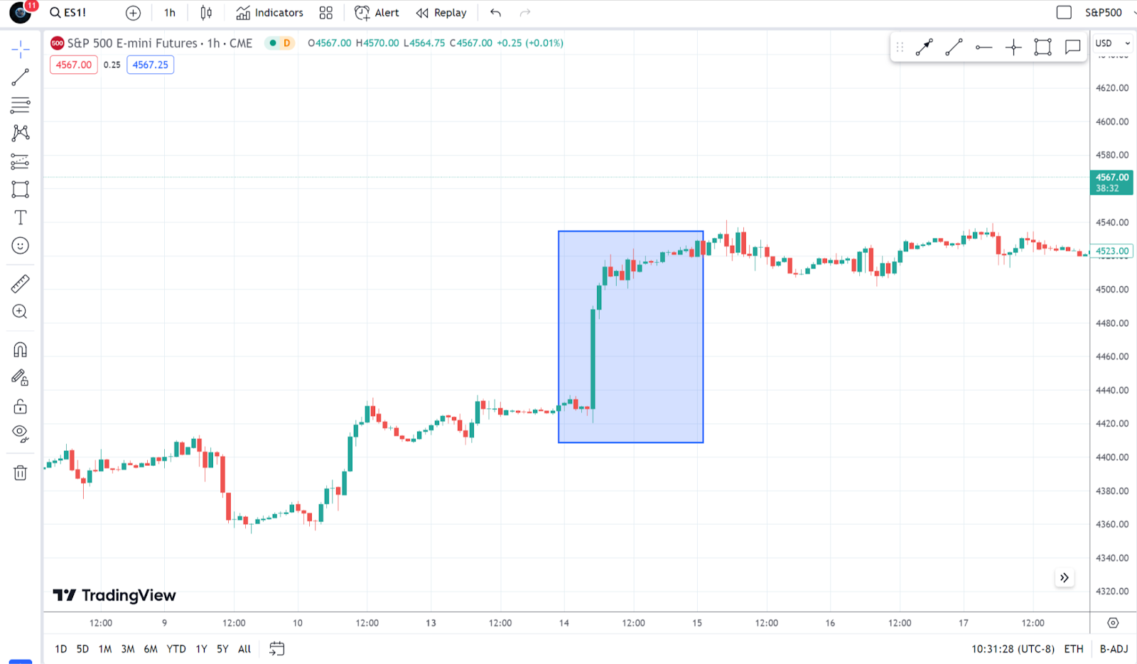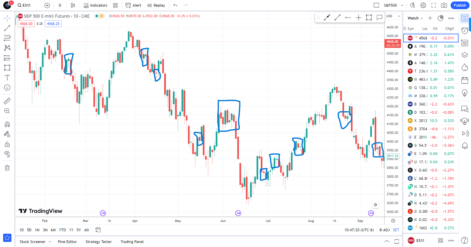 When you open up a trading platform, you will have the option to select the type of graph you want to analyze an asset on. You want to choose the candlestick charts as that allows you to see real time volatlity, volume and is the easiest way to spot when a breakout occurs. When trading the SPY or SPY Mini (ES1 Mini) the candlestick chart will be the only type of graph you want to analyze the market with and place trades on. Trading this chart will allow you to see the price movement be very rapid, this is called price action. If you go to the ES1 or ES1 Mini in any morning of a weekday on the platform found at tradingview.com and go down to the 5 minute chart, you will see price move fast.