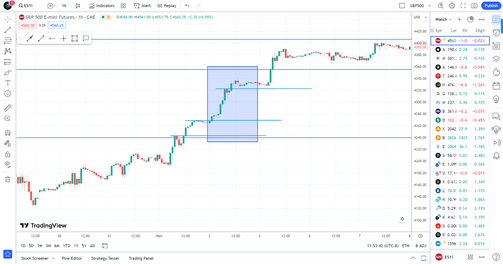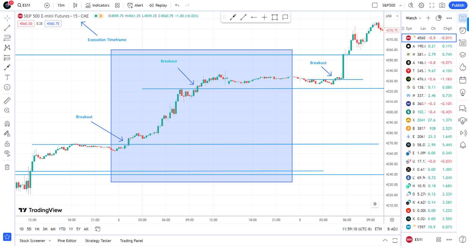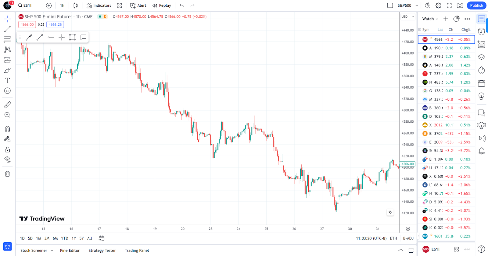 When you open up a trading platform, you will have the option to select the type of graph you want to analyze an asset on. You want to choose the candlestick charts as that allows you to see real time volatlity, volume and is the easiest way to spot when a breakout occurs. When trading the SPY or SPY Mini (ES1 Mini) the candlestick chart will be the only type of graph you want to analyze the market with and place trades on. Trading this chart will allow you to see the price movement be very rapid, this is called price action. If you go to the ES1 or ES1 Mini in any morning of a weekday on the platform found at tradingview.com and go down to the 5 minute chart, you will see price move fast.