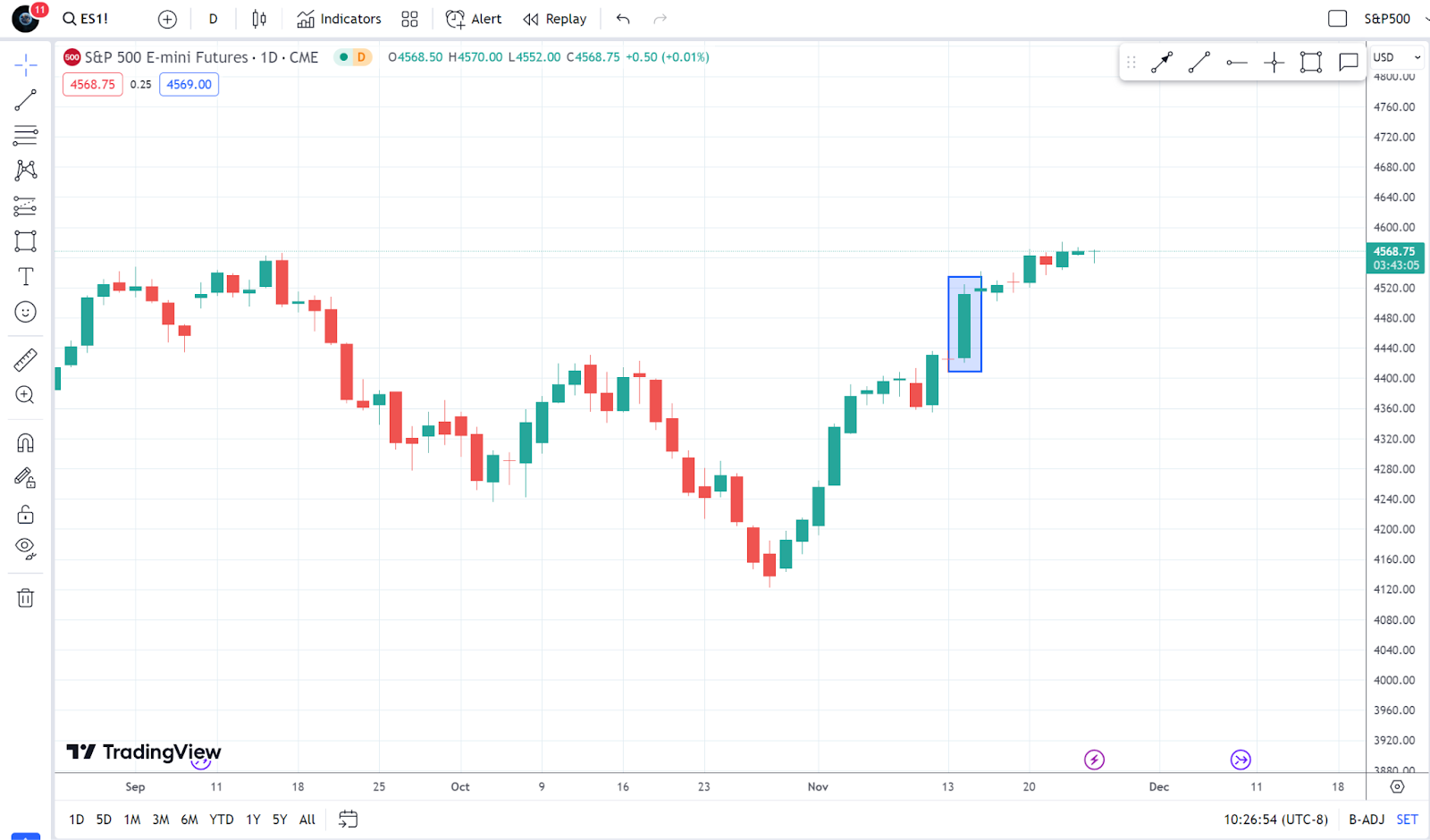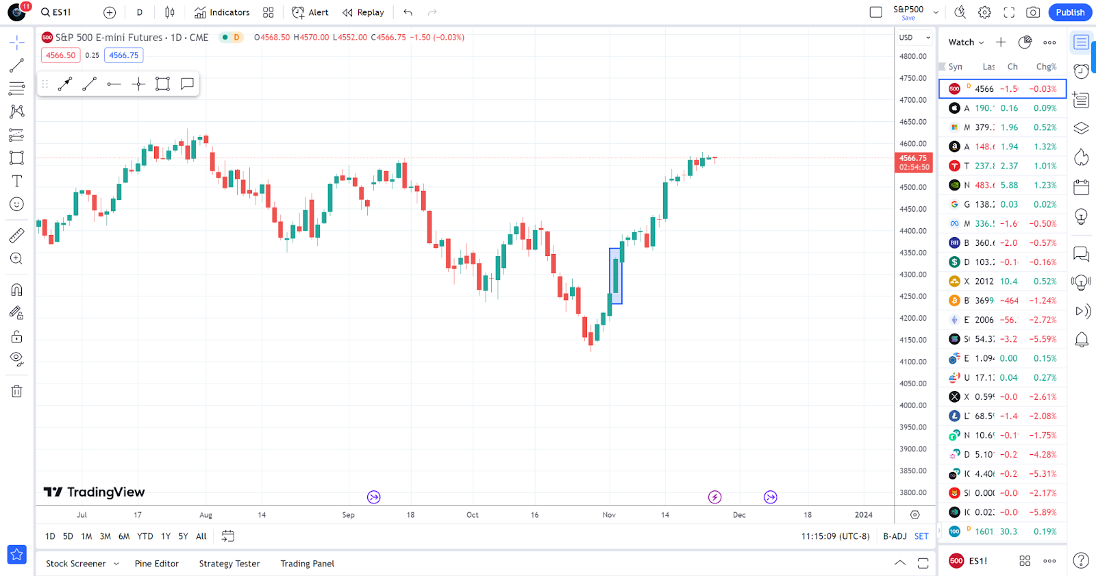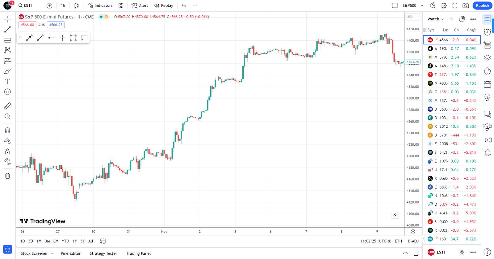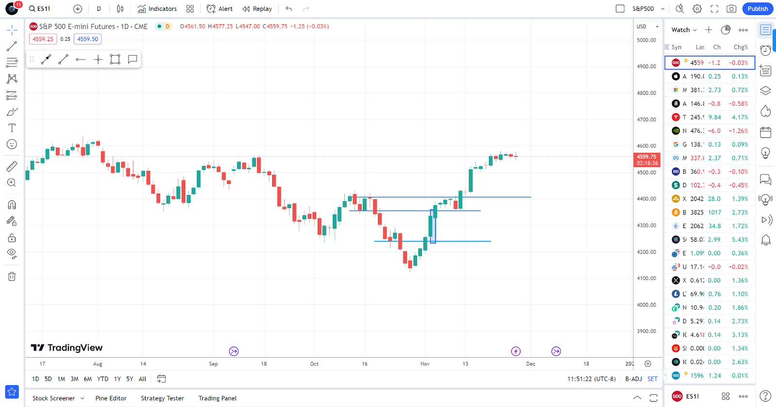 When you open up a trading platform, you will have the option to select the type of graph you want to analyze an asset on. You want to choose the candlestick charts as that allows you to see real time volatlity, volume and is the easiest way to spot when a breakout occurs. When trading the SPY or SPY Mini (ES1 Mini) the candlestick chart will be the only type of graph you want to analyze the market with and place trades on. Trading this chart will allow you to see the price movement be very rapid, this is called price action. If you go to the ES1 or ES1 Mini in any morning of a weekday on the platform found at tradingview.com and go down to the 5 minute chart, you will see price move fast.
