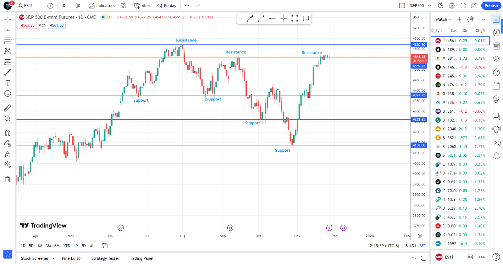 Think of support and resistance as the floor and ceiling of the markets current price point. The price is trying to grow as investors become optimistic of the overall health of the economy but they know that historically, it has stolled in some levels, which psychologically means that people are likely to be cautious round there as the past does equal the future here, very often. Think of breakouts of such zones like a baseball game. Someone hits the ball hard with momentum and the other player runs to the other base more safer than not. In the markets, when there is a breakthrough of either resistance or support, it will most likely run towards the other level below or above that. It’s crucial to learn to identify this levels well and stick to trading in between them, all while following the overall direction.
