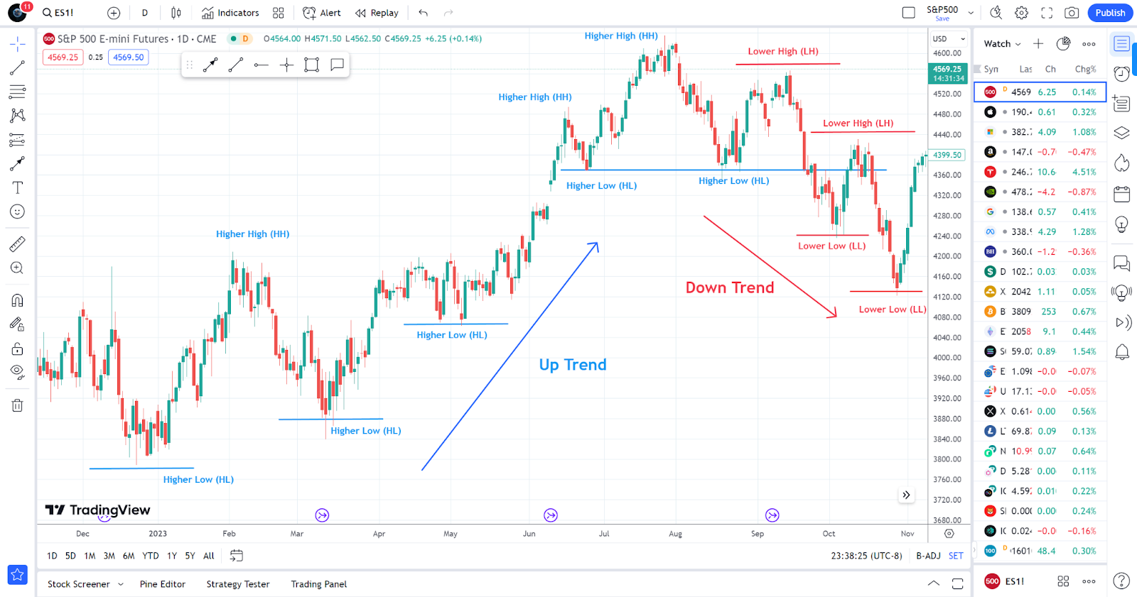 Daily Timeframe Showing Higher Highs & Lower Lows.